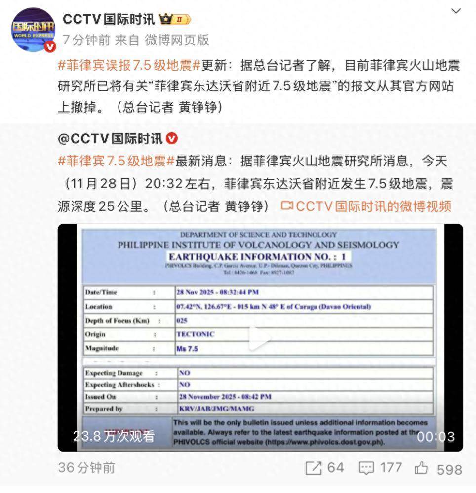 稍早前,菲律宾火山地震研究所发布消息,11月28日20时32分左右,菲律宾东达沃省附近发生7.5级地震,震源深度25公里。