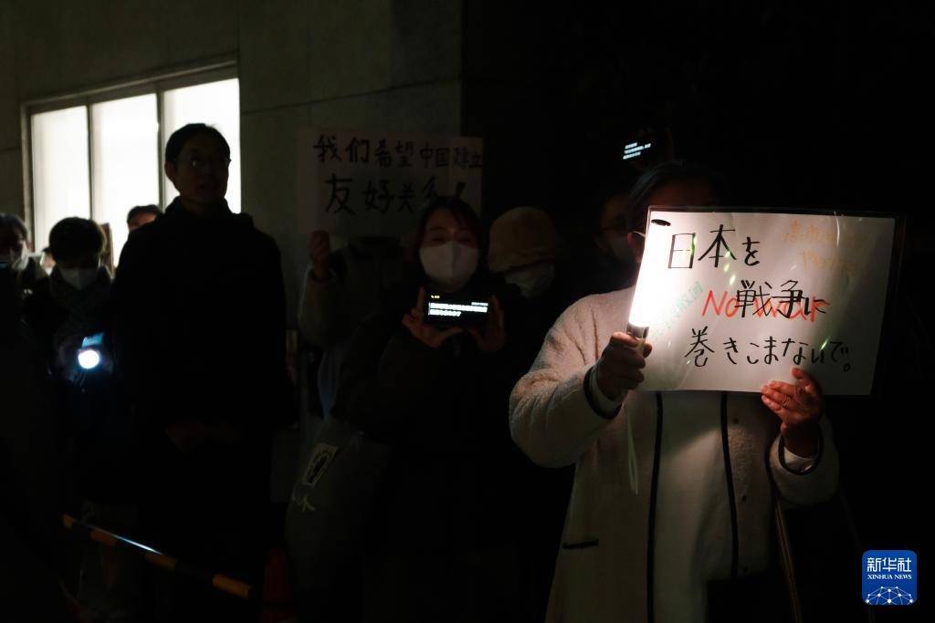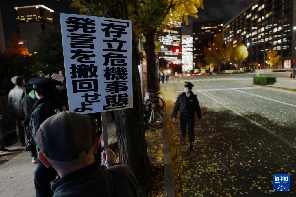 这是继21日和25日的抗议活动后,在首相官邸前举行的又一次大规模抗议集会,有数百人参加。抗议者手持写有“高市辞职”“不能忘记历史,不能重蹈覆辙”等字样的牌子,要求高市撤回涉台错误言论。